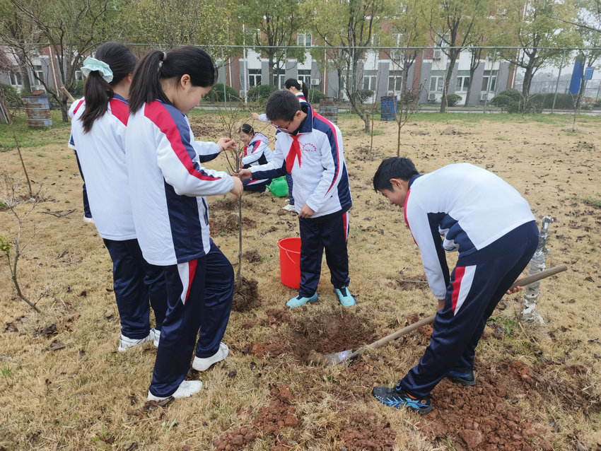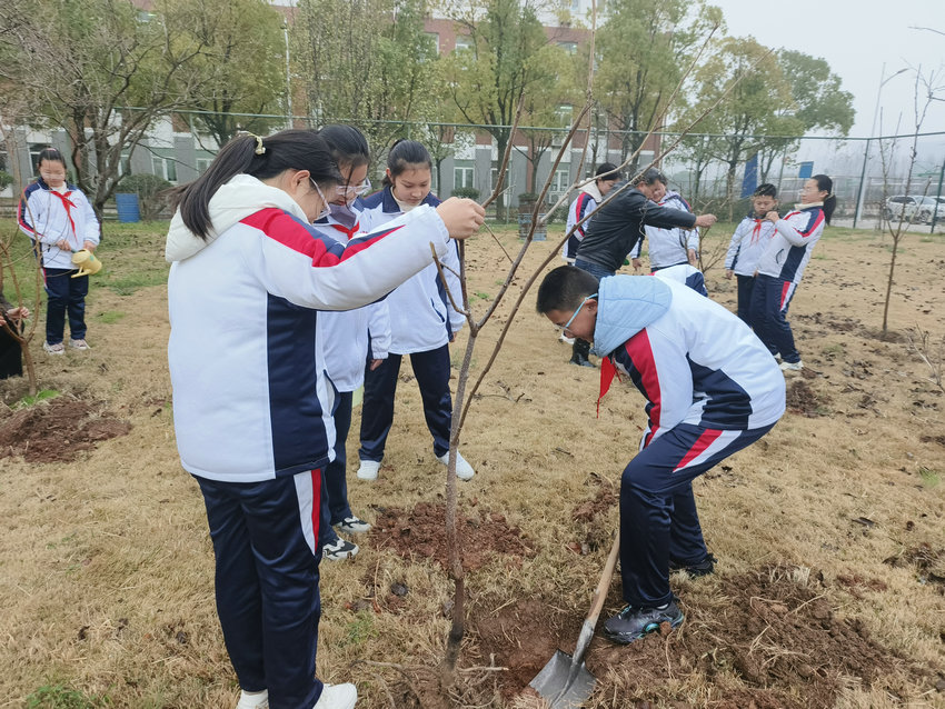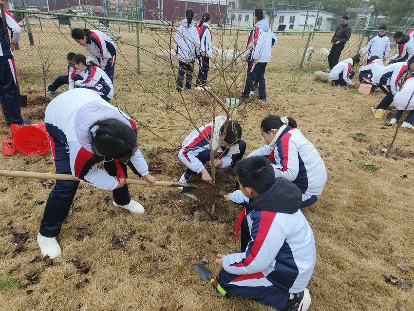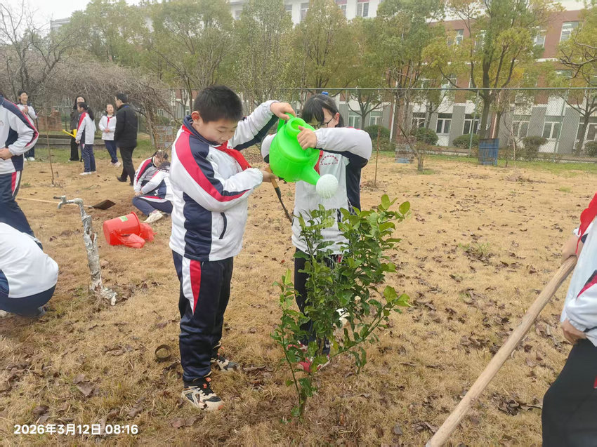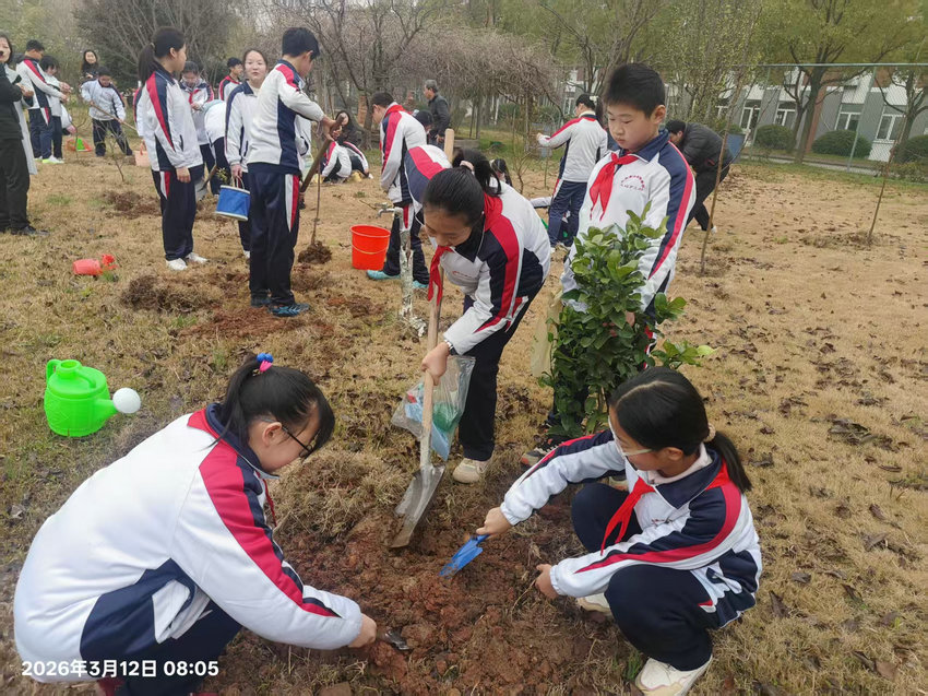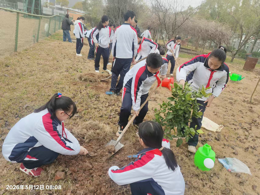 春回大地万物苏,植树添绿正当时。3 月 12 日小学部组织六年级学生代表走进校园植物园,开展植树活动。同学们以饱满的热情栽种下桃树、橘树、柿子树,用实际行动为校园增添新绿,将环保理念深植心间。