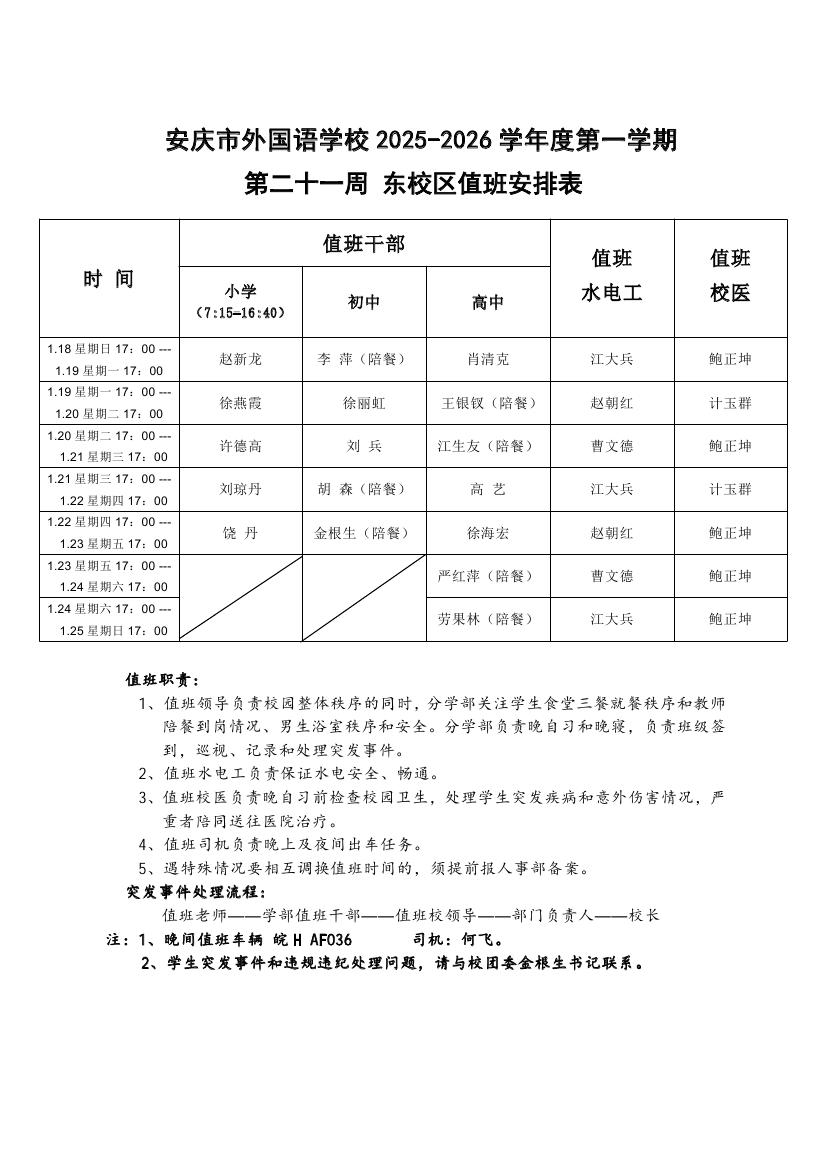 2025-2026学年度第一学期第二十一周东区干部值班表
