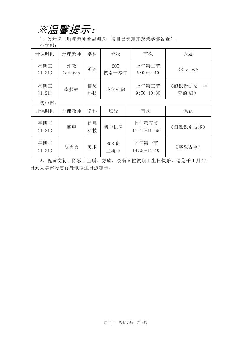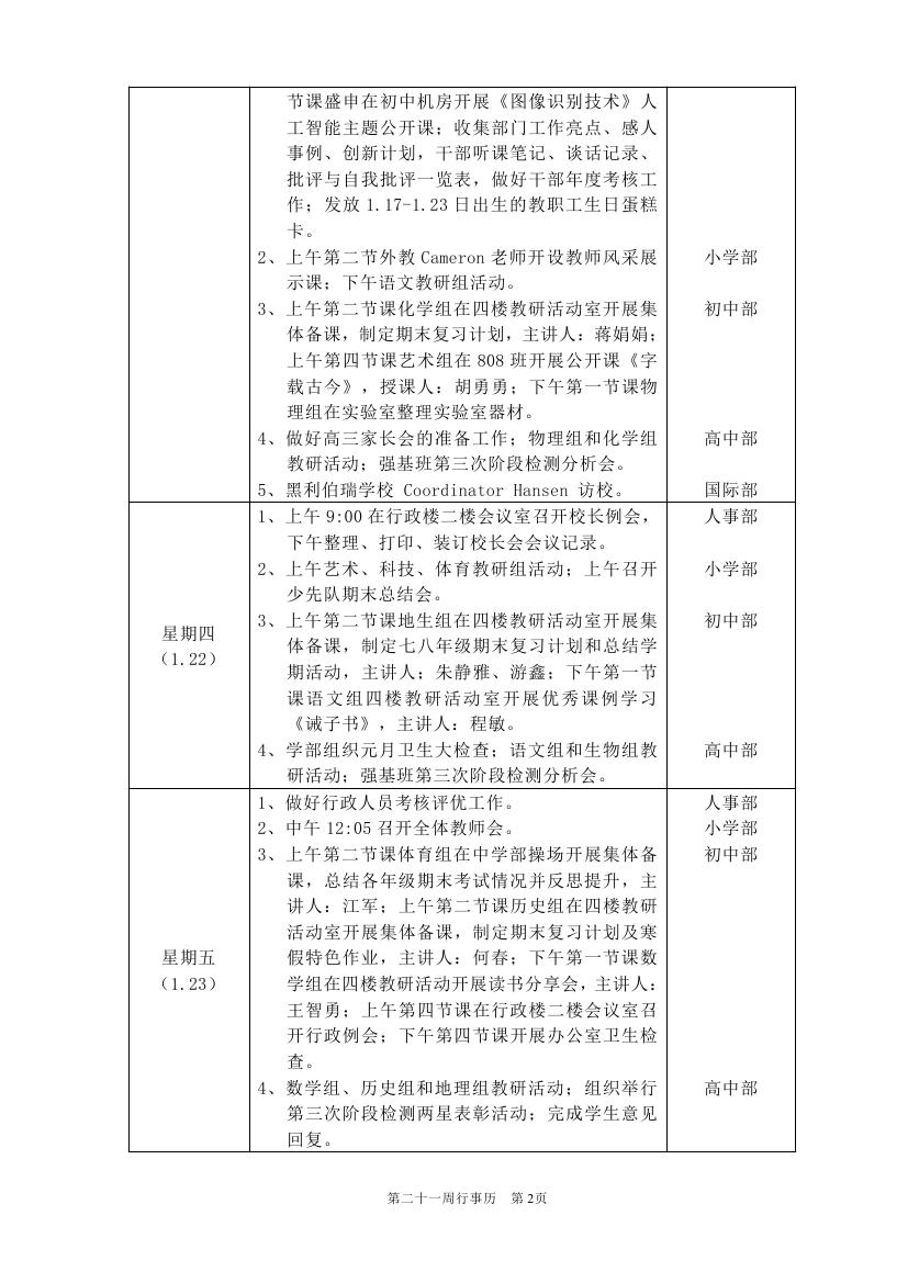 2025-2026学年度第一学期第二十一周行事历(东区)