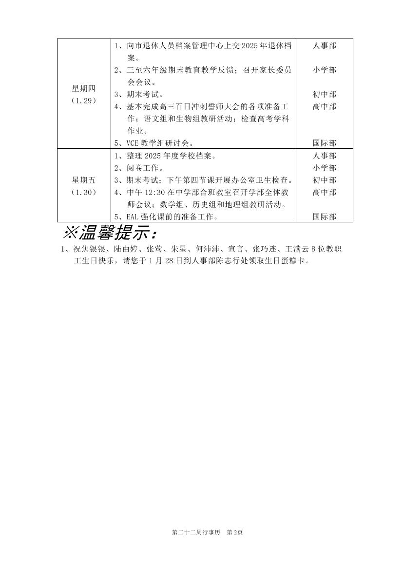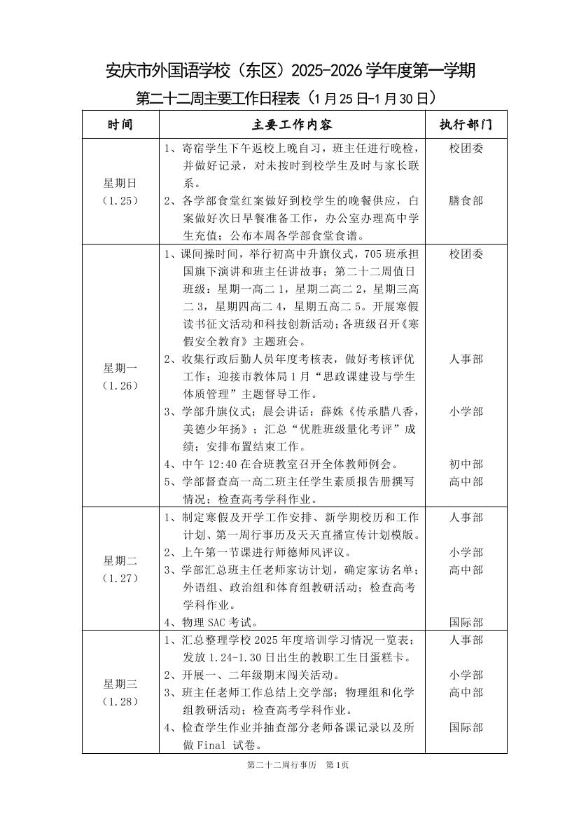 2025-2026学年度第一学期第二十二周行事历(东区)