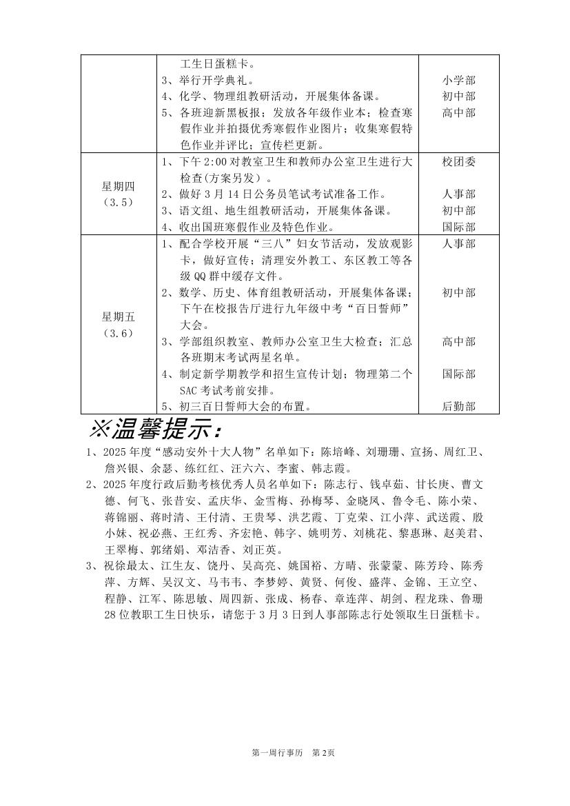 2025-2026学年度第二学期第一周行事历(东区)