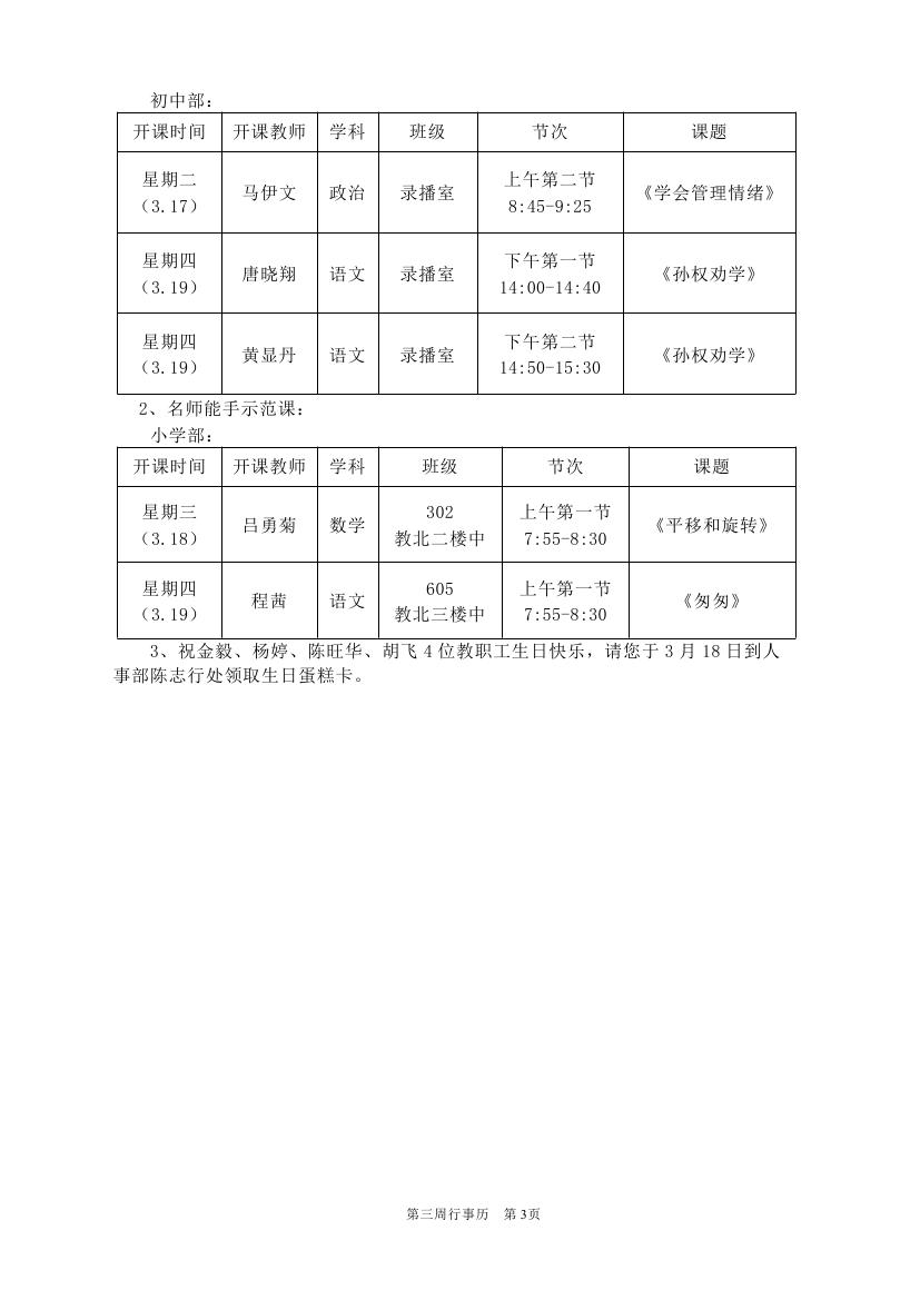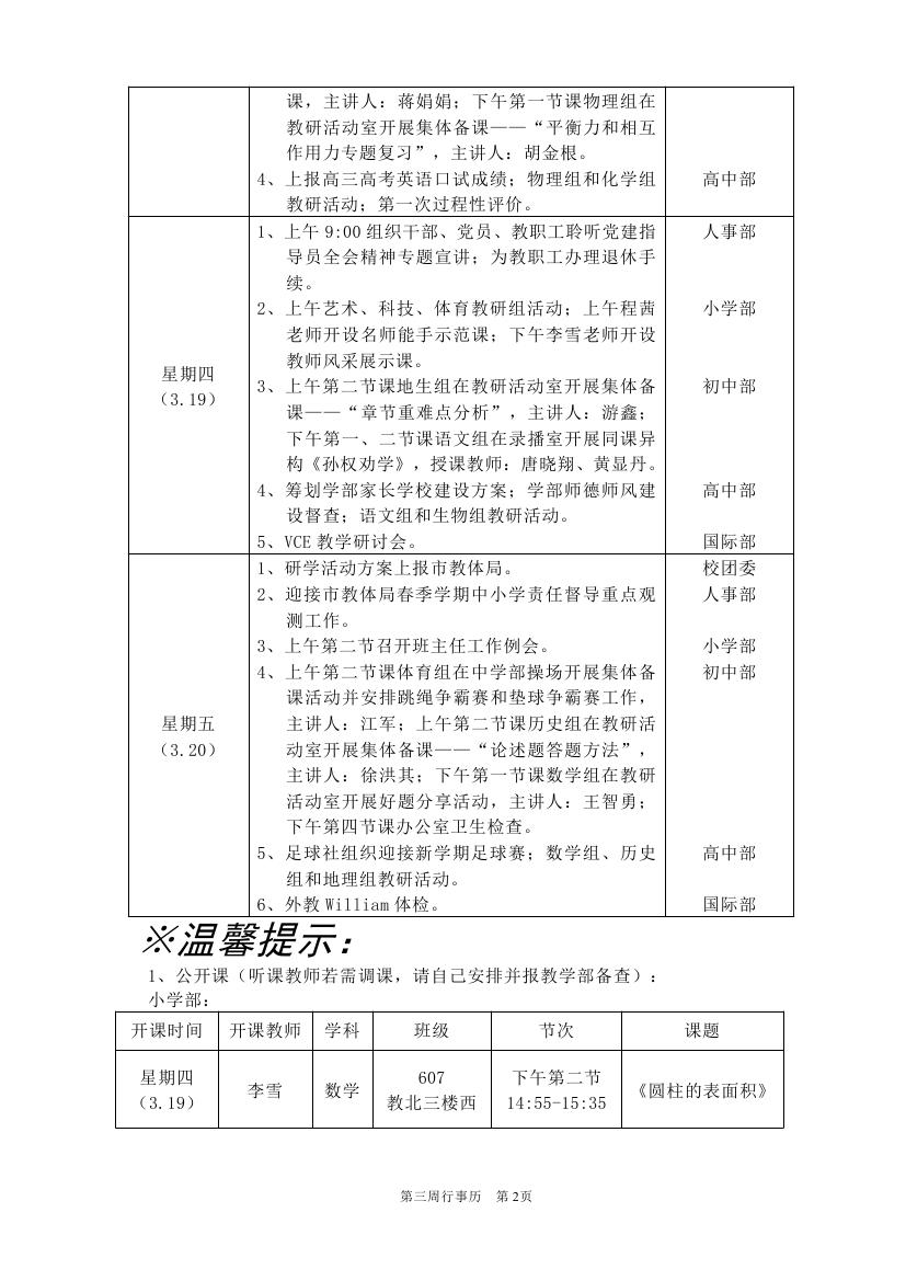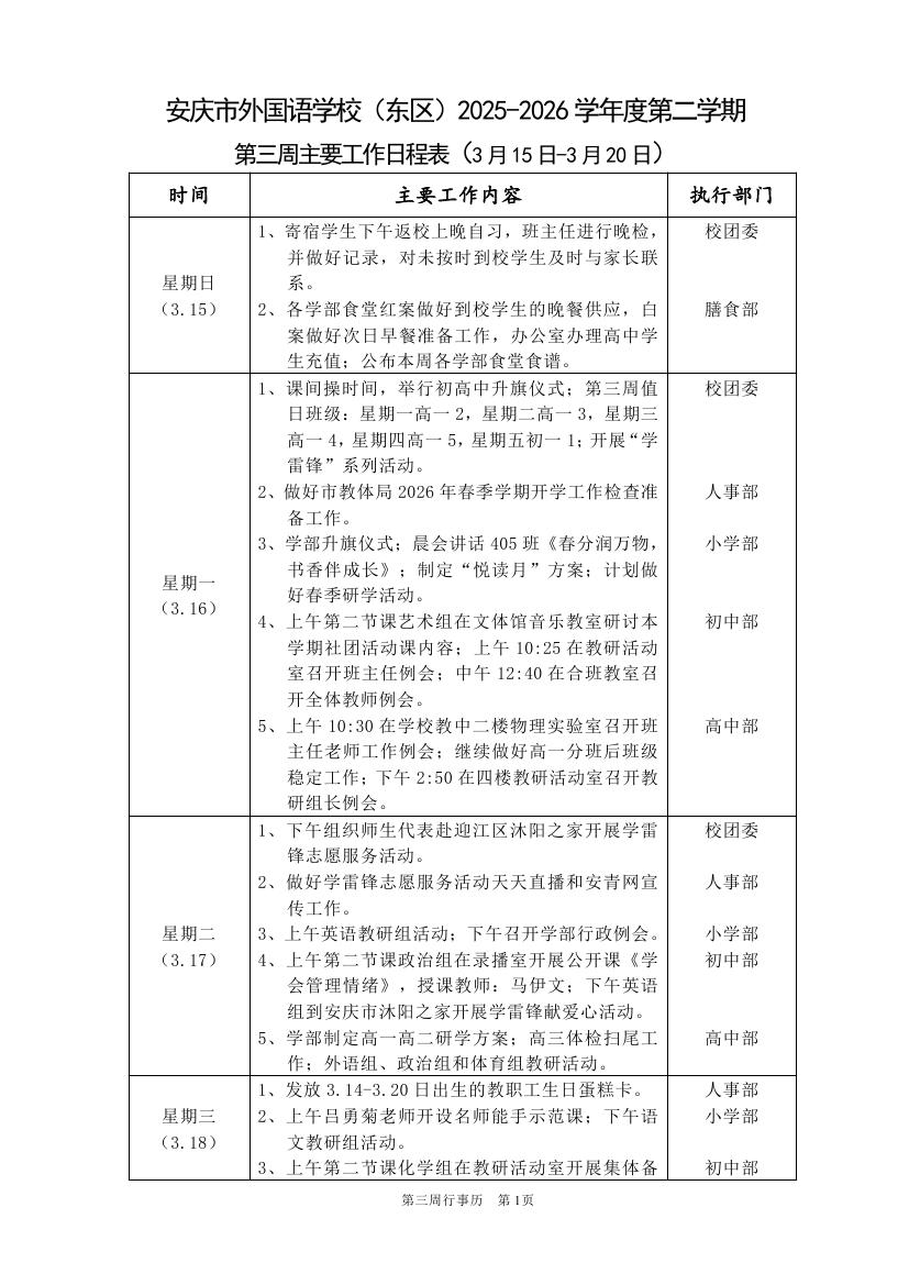 2025-2026学年度第二学期第三周行事历(东区)