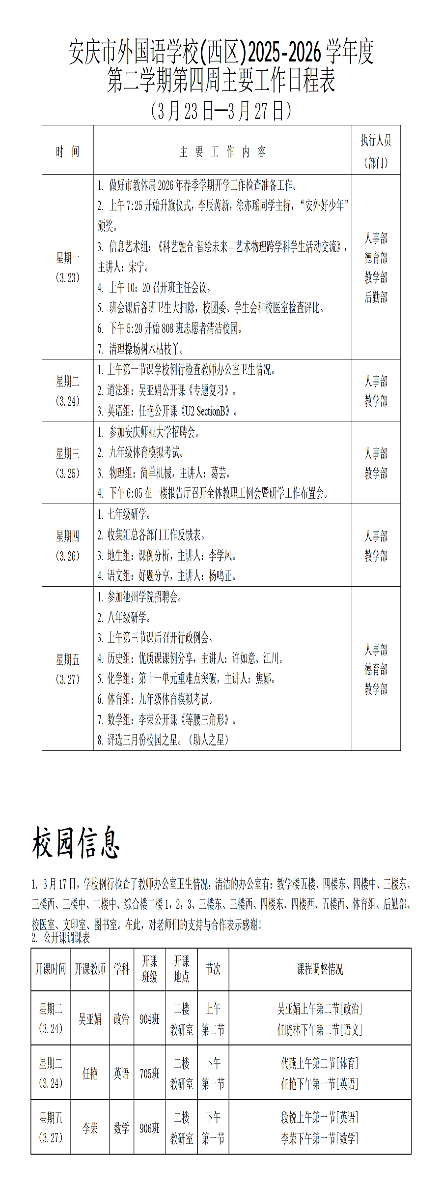 2025-2026学年度第二学期第四周行事历(西区)