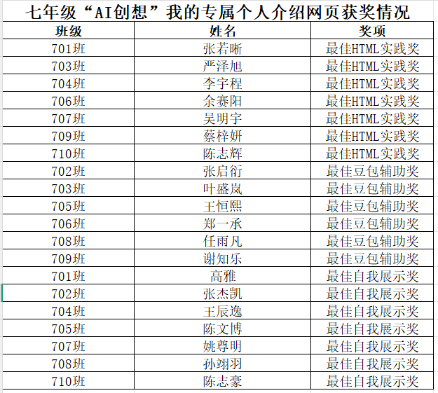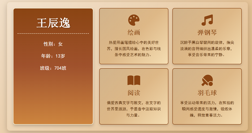 25-26学年第一学期,初中部信息科技组聚焦AI素养培育,分年级开展特色实践活动,为学子搭建数字创作平台。七年级以“AI创想”为主题,指导学生设计专属个人介绍网页,将AI技术与创意表达结合,提升数字设计与实操能力;八年级开展AI班牌设计活动,学生巧用AI工具构思设计,打造兼具班级特色与科技感的专属班牌。本次系列活动贴合学段特点,让学生在实践中感受AI魅力,锻炼创新思维与动手能力,进一步丰富了校园科技文化生活,推动信息科技素养在校园落地生根。