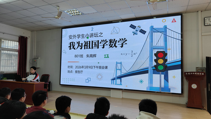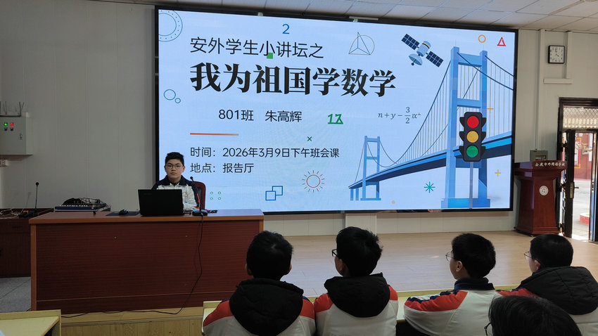 为厚植学生家国情怀,激发数学学习热情,近日,我校“安外小讲坛”特别推出“我为祖国学数学”活动周主题专场活动。801班朱高辉同学走上讲台,用青春视角解读数学魅力,将数学学习与强国使命紧密相连,校园里洋溢着勤学善思、爱国奋进的浓厚氛围。