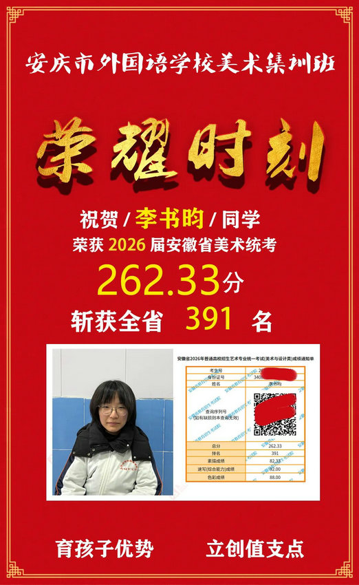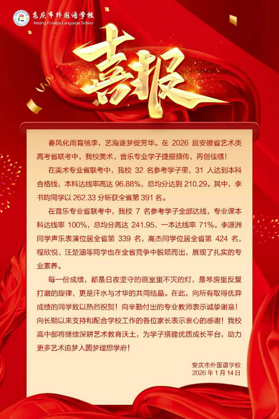 冬日传喜,艺路生花!随着 2026 届安徽省艺考成绩陆续发布,我校学子的捷报接连刷屏 —— 音乐、美术两大赛道齐发力,学子们用专业实力书写了属于我校艺考的新篇章!