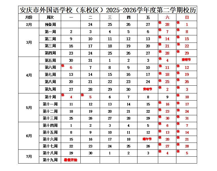 安庆市外国语学校(东校区)2025-2026学年度第二学期校历